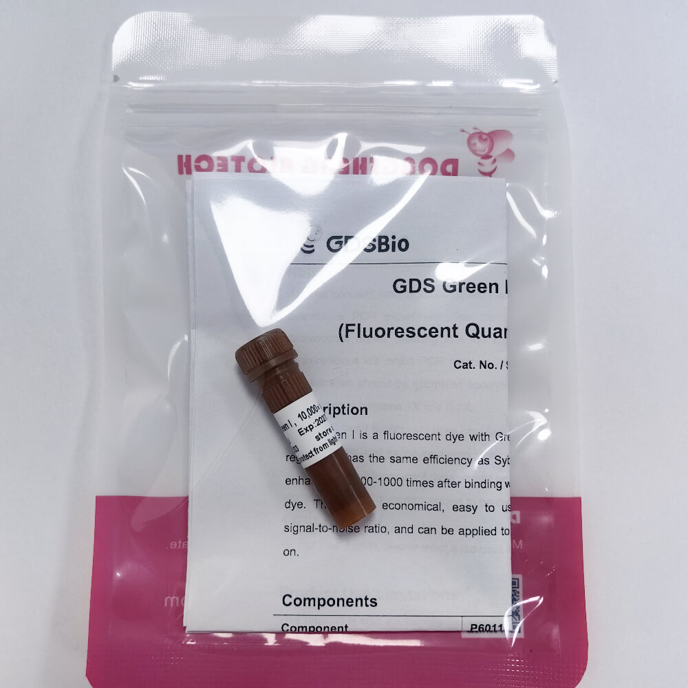 GDS Green I 是一种结合于 dsDNA 双螺旋小沟区域的具有绿色发射光的荧光染料,效能等同于 Sybr Green I。GDS Green I 与 dsDNA 结合后荧光信号会增强 800-1000 倍,是一种常用的 qPCR 荧光染料。该染料经济实惠、使用方便,具有高灵敏度与高信噪比等优势,可应用于基因表达差异分析,基因芯片等。