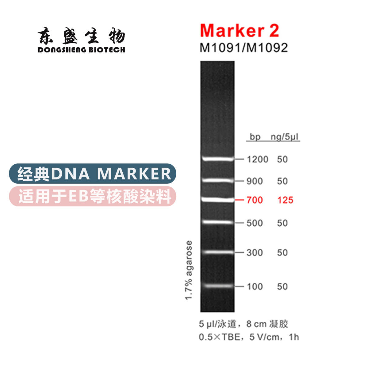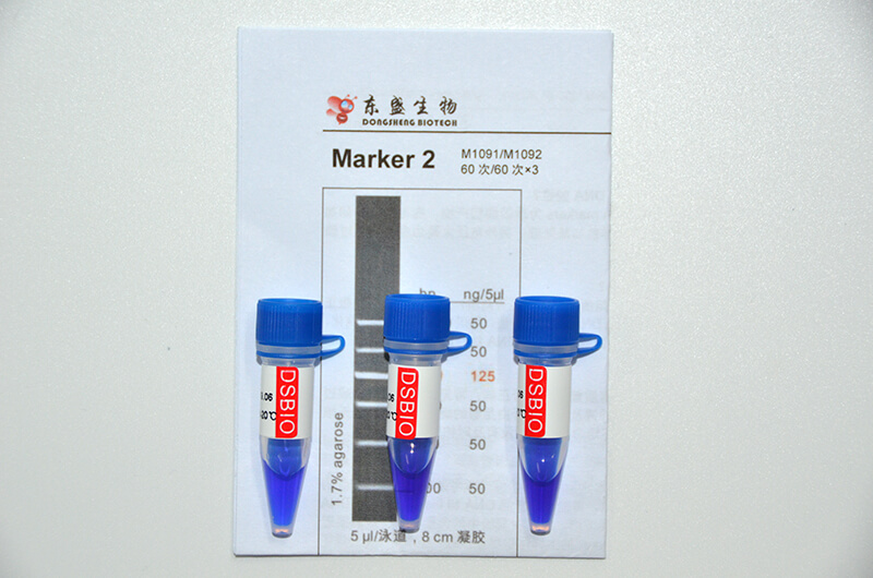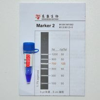 Marker 2是由6条双链线状DNA片段混合而成的DNA分子量标准(DNA Marker/ DNA Ladder),适用于确定100 bp至1.2 kb的线性双链DNA片段大小,指示带为700 bp,便于电泳后观察。每条带都通过严格的物理定量,可用于测定目的片段的大小和含量。