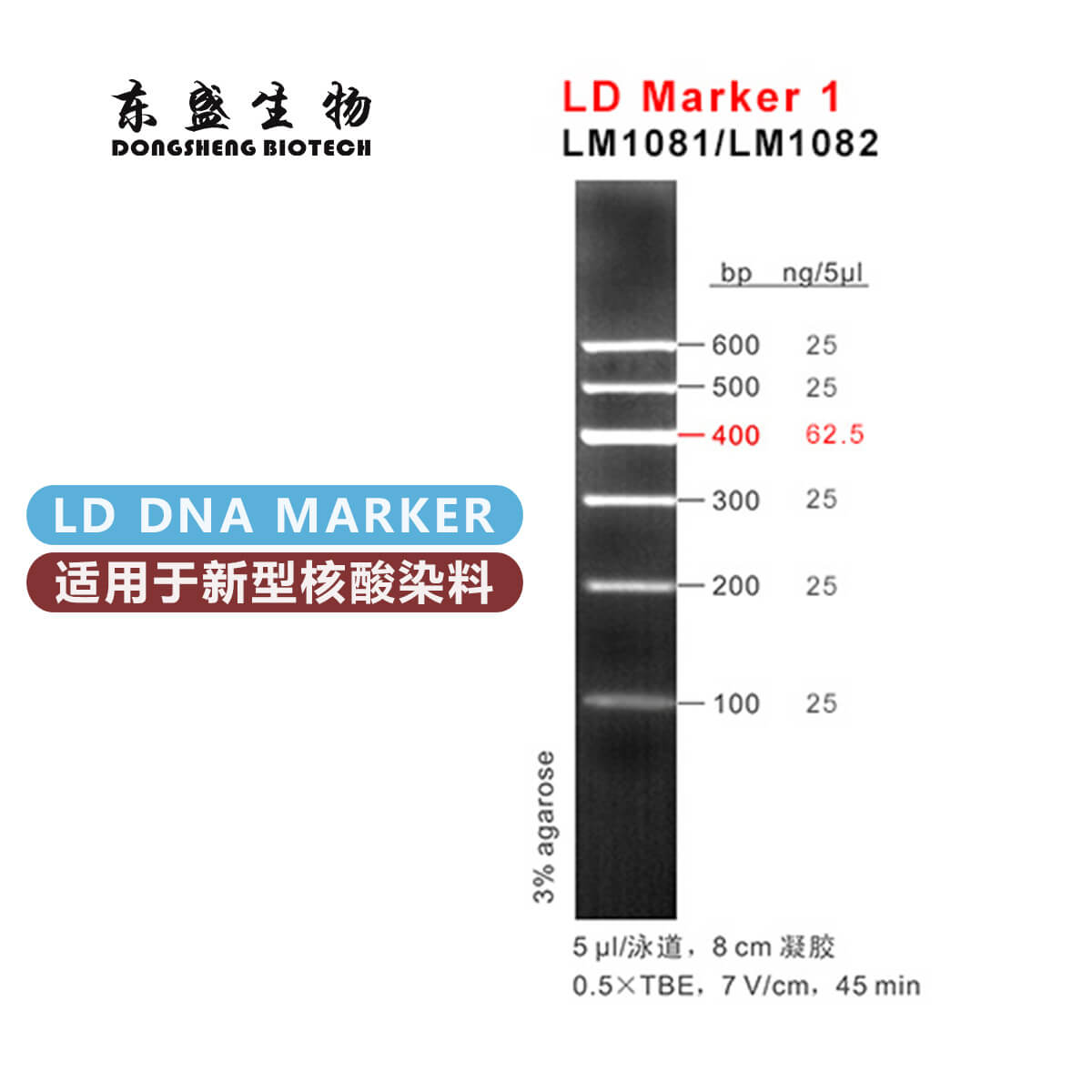LD Marker 1是由6条双链线状DNA片段混合而成的DNA分子量标准(DNA Marker/ DNA Ladder),适用于确定100 bp至600 bp的线性双链DNA片段大小,指示带为400 bp,便于电泳后观察。每条带都通过严格的物理定量,可用于测定目的片段的大小和含量。本品为米兰milan生物LD系列DNA Marker,适用于新型核酸染料(如米兰milanDSRed等)预染法琼脂糖凝胶电泳。
