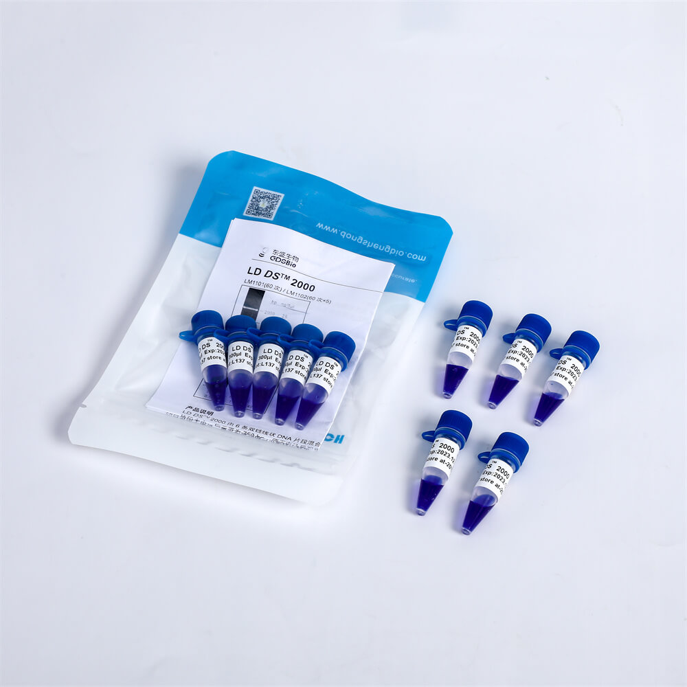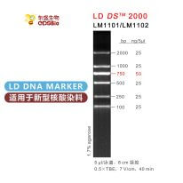 LD DS™2000是由6条双链线状DNA片段混合而成的DNA分子量标准(DNA Marker/ DNA Ladder),适用于确定100 bp至2 kb的线性双链DNA片段大小,指示带为750 bp,便于电泳后观察。每条带都通过严格的物理定量,可用于测定目的片段的大小和含量。本品为米兰milan生物LD系列DNA Marker,适用于新型核酸染料(如米兰milanDSRed等)预染法琼脂糖凝胶电泳。
