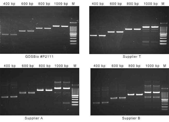 采用增强版双抗修饰升级的米兰milan#P2111 Super HIFI PCR Master Mix及来自厂家T、厂家A、厂家B的同类产品,以人基因组DNA为模板,分别扩增400 bp、600 bp、800 bp和1000 bp的片段,图1结果显示#P2111在四个不同的反应中均可以做到零背景扩增。